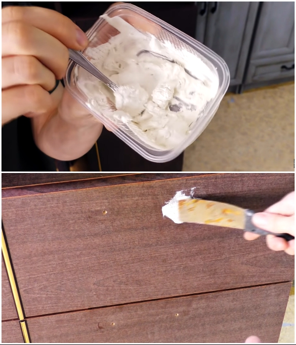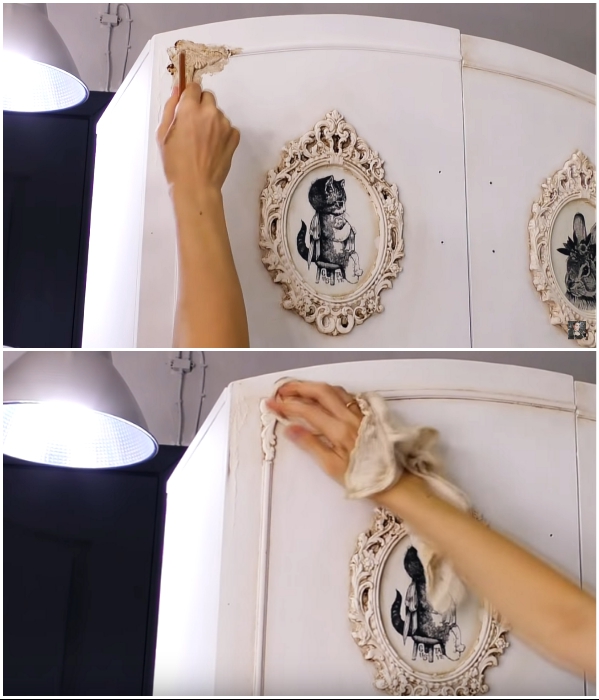 Учитывая, что автор видеоролика хотела иметь шкафы в стиле шебби-шик, то их предстояло еще и «состарить». Для этого ей понадобилось приобрести воск для мебели (прозрачный и цвета мореный дуб), найти хлопчато-бумажную ткань. Техника выполнения довольно проста - чтобы создать благородные потертости, необходимо наносить небольшое количество воска темного цвета на выпуклые места молдингов и декоративных гипсовых элементов, края и углы дверей/ящиков. Воск нужно хорошенько втирать, а лишний материал лучше сразу удалять с помощью чистой тряпки или используя прозрачный воск.