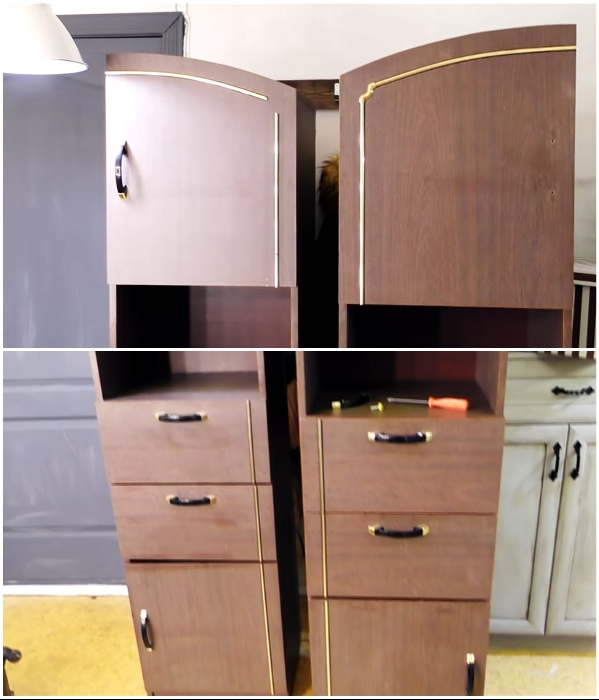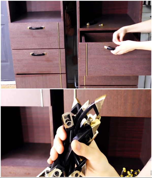 На этом кардинальное преобразование угрюмой, вышедшей из моды мебели закончилось. Чтобы придать ей более непринужденный вид и создать особую атмосферу, креативная хозяйка прикрутила ...разные ручки на каждой дверце и ящиках.