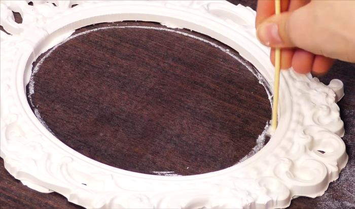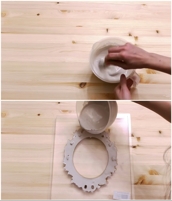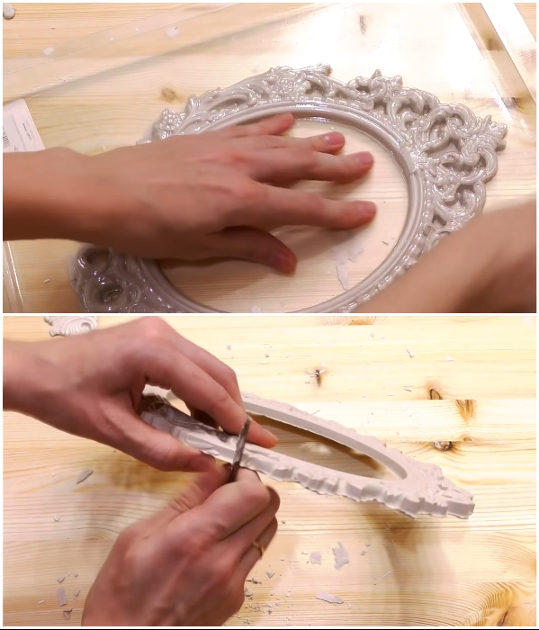 Чтобы подготовленный раствор равномерно распределялся и не образовывались воздушные пустоты, форму следует немного встряхивать. Заготовку с полностью залитым гипсом нужно оставить до полного высыхания. Поскольку этот материал довольно быстро схватывается, то за пару часов декоративные элементы уже будут готовы к дальнейшему применению. После того, как рамочки вынули из формы, их нужно осмотреть. Неровности, которые образовались по краям изделия и все излишки необходимо аккуратно срезать ножом.