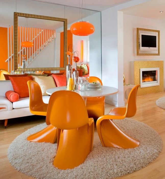 Хотите ярких красок? Добавьте в оформление темной комнаты оранжевый цвет. Тыква, апельсин, абрикос — все оттенки оранжевого превратят пространство в место тепла и уюта. При наличии оранжевого цвета комната как-будто светится изнутри и усиливает свет ламп и даже солнечный свет из маленького окна.