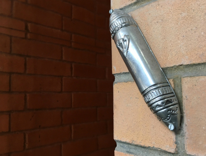 Мезуза у входной двери. | Фото: Триникси. С чего начинается дом истинно верующего израильтянина? Нет, не с двери, не с порога, а с оригинальной колбы, прикрепленной к стене у входной двери. Эта вещь называется мезуза, внутрь нее кладут свиток со словами из Торы. Перед тем, как войти в дом, каждый верующий еврей должен поцеловать мезузу, приложив два пальца к ней, а потом к губам.