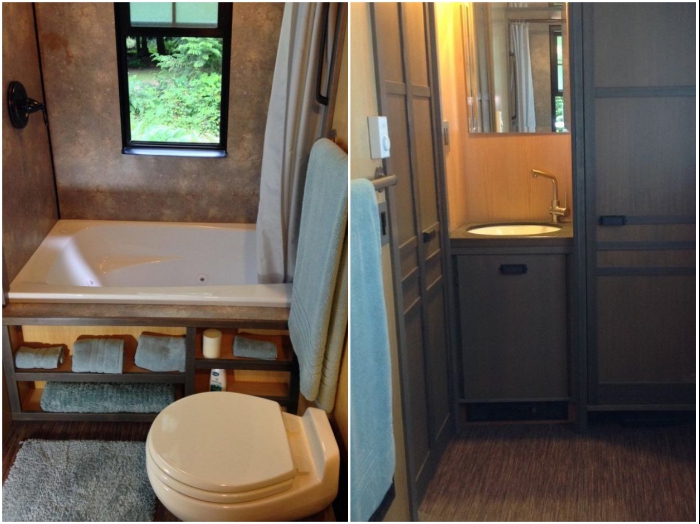 Сразу же за кухней находится полноценная ванная комната с туалетом, рукомойником и, как ни удивительно для таких габаритов жилья, мини-ванной джакузи, в которой можно расслабляться, когда заблагорассудится.