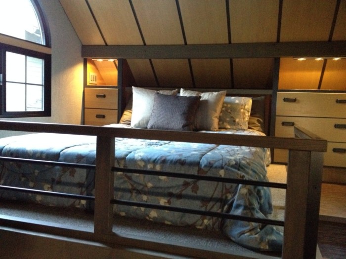 Благодаря высоким потолкам в домике удалось обустроить просторную спальню, которая располагается на втором ярусе. Лофтовая часть жилого пространства получилась довольно свободной, комфортной и светлой, потому что Крис установил окна в этой зоне. Здесь, помимо огромной кровати, были созданы встроенные комоды с открытой верхней полкой, теперь они выполняют как функцию прикроватной тумбочки, так и вместительных шкафов с выдвижными ящиками.