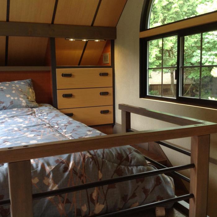 По возвращению домой в город Аврора (Aurora), штат Орегон, имея уже немалый опыт проектирования и строительства, вдохновившись японским минимализмом, Крис решил построить собственный крошечный домик. На миниатюрном участке земли размером 3 на 6 метров получился вполне комфортный коттедж, вместительность которого повысилась благодаря созданию второго яруса, ведь высота потолков в самой высокой точке составляет 4,5 метра.