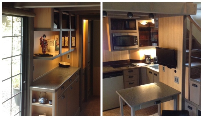 Большие окна и стеклянная раздвижная дверь, являющаяся оригинальной интерпретацией традиционной японской двери сёдзи, делает эту зону особенно светлой, поэтому гостиная стала подходящим местом и для отдыха, и для работы. Чтобы мебель вписалась в нужное пространство, изобретательный американец самостоятельно сделал диван, с вместительными выдвижными ящиками, вещевой шкаф и тумбочку. Этого оказалось вполне достаточно, чтобы спрятать только нужные вещи, не переполняя жилую площадь хламом, припрятанным на всякий случай.