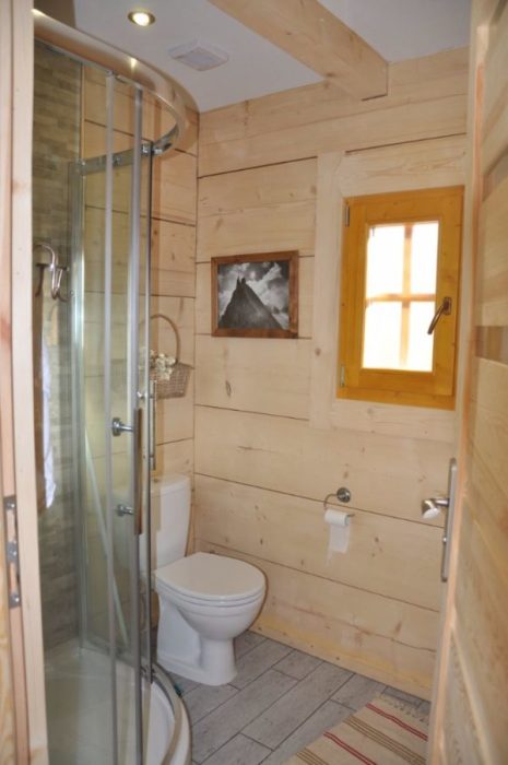 За кухонной зоной спрятана ванная комната с вполне современной душевой кабиной и полноценным унитазом, поэтому комфорт как для хозяев, так и для нагрянувших гостей будет обеспечен сполна.
