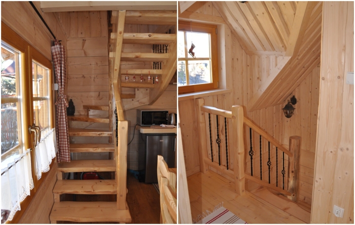 Благодаря высоким потолкам спальные комнаты вынесены на второй ярус, к которым ведет сосновая лестница ручной работы с оригинальными кованными элементами. Эта деталь интерьера демонстрирует особое мастерство создателей крошечного дома и обеспечивает удобный и вполне безопасный доступ на верхний этаж.