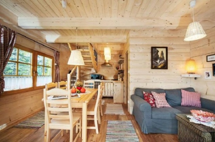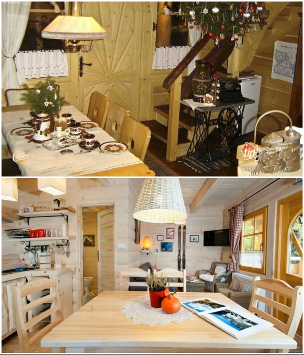 Но опасения отпадают сами собой, стоит только лишь переступить порог очаровательной избушки, интерьер которой продуман до мельчайших подробностей. Порадовало то, что специалисты компании The Little Log House грамотно и рационально используя каждый миллиметр внутреннего пространства, смогли организовать вполне достойный быт на площади всего лишь 27 кв. метров.