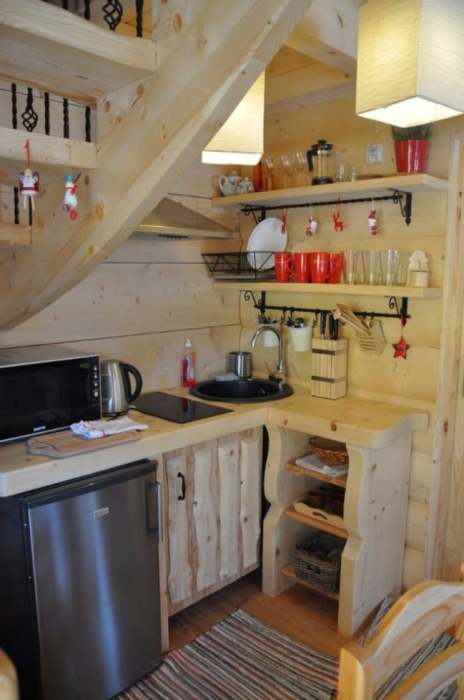 Вполне укомплектованная и современная кухня в сказочном мини-срубе «Stunning Gate Lodge». | Фото: itinyhouses.com. С другой стороны нижнего яруса расположена небольшая кухня, в которой оборудована рабочая поверхность с варочной панелью и круглой мойкой, спрятанной в углу добротного деревянного гарнитура ручной работы, несколько тумб, открытые навесные полки служат хранилищем для кухонной утвари и необходимых продуктов. Чтобы сэкономить место, установили небольшой холодильник под столешницей, так что можно считать – кухня имеет встроенную бытовую технику.