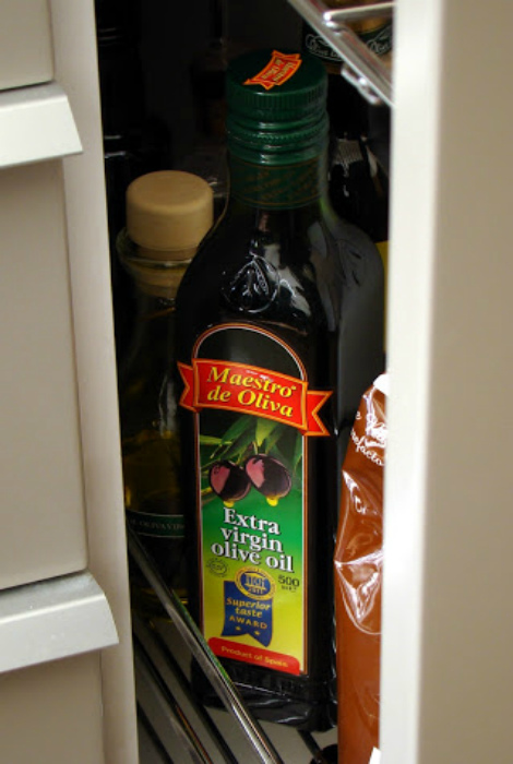 Хранение оливкового масла. | Фото: Олив Лайн. Оливковое масло одинаково плохо переносить высокие и низкие температуры. Поэтому не стоит хранить его возле плиты или в холодильнике. Идеальным местом для бутылочки с маслом станет темный кухонный шкафчик вдали от печки.