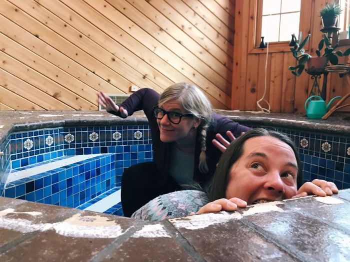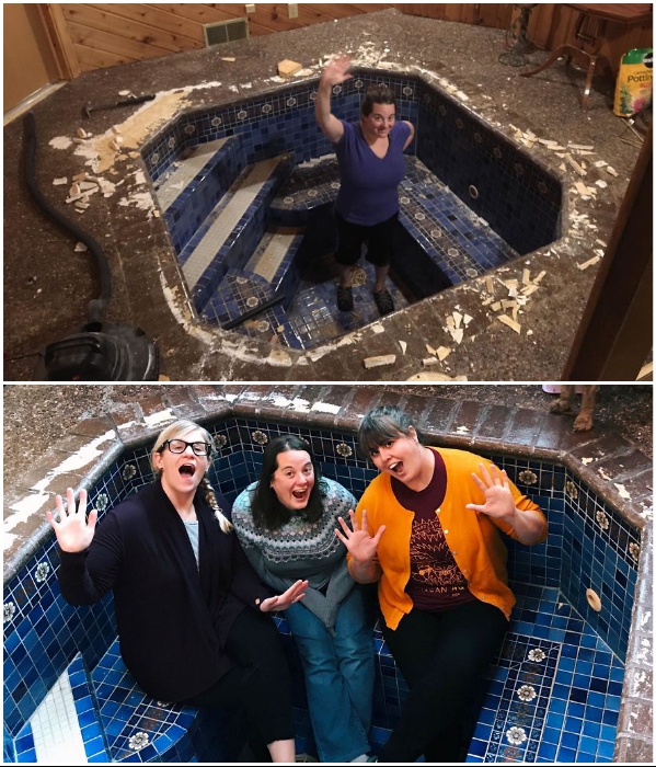 Сразу после того, как гидромассажная ванна была найдена, супруги вызвали специалиста, который проверил все системы, насосов, подключений и осмотрел само помещение. Он дал свои рекомендации, после которых Дженни с подругами принялись отмывать многолетнюю пыль и убирать налет на швах между яркой плиткой.