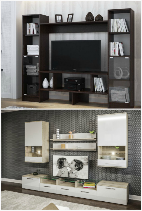 Громоздкая стенка под телевизор. | Фото: Pinterest, Chip Stock. Несмотря на то, что стенки под телевизор являются довольно современными образцами мебели, они имеют массу недостатков. Во-первых, большинство из них достаточно громоздкие и занимают много места. Во-вторых, такая мебель лишает вас возможности легко сделать перестановку. По мнению Novate.ru, современные плазменные телевизоры лучше всего крепить на стену или устанавливать на небольшую полочку.