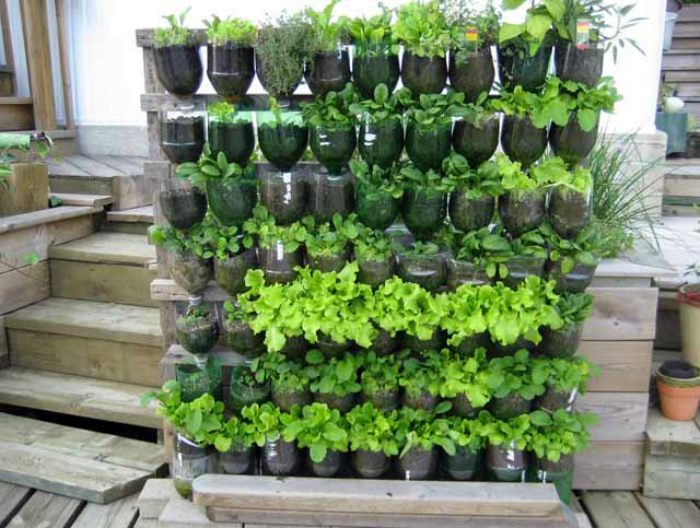 Вертикальная стена зелени. | Фото: Самоцветик. Один деревянный поддон и 10-15 обрезанных и прикрепленных к нему пластиковых бутылок позволит обзавестись чудесной «зеленой» перегородкой, которая не только сэкономит место в саду, но и украсит придомовую территорию.