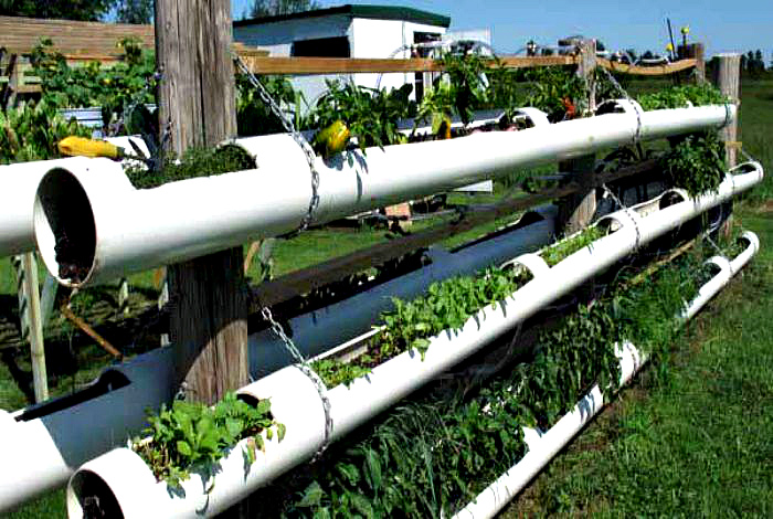 Подвесные грядки в ПВХ-трубах. | Фото: Pinterest. Незатейливая конструкция из широких ПВХ-труб отлично подойдет для выращивания клубники, перцев и других культур. Преимущество такого выращивания в том, что подвесные грядки совсем не занимают места на территории, а также помогают зонировать огород.