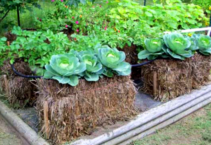 Оригинальные и компактные приподнятые грядки из сена, которое, как оказалось, может выполнять не только роль теплого наполнителя, но и формировать сами контуры клумбы.