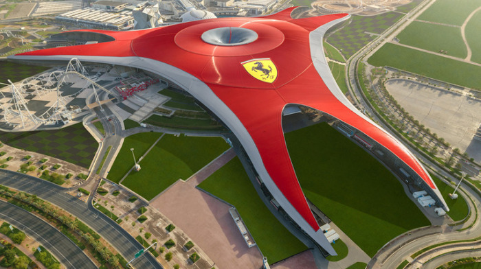 Тематический парк Ferrari World в Абу-Даби поражает своими гигантскими размерами и необычной формой. Это поистине уникальное сооружение расположено на искусственном острове Яс и на сегодняшний день является самым крупным крытым развлекательным комплексом. Вид сверху напоминает то ли звезду, то ли осьминога, а при взгляде сбоку в очертаниях здания угадываются характерные изгибы силуэта знаменитого автомобиля Ferrari GT. Площадь только одного центрального помещения парка составляет 86000 кв.м. А крышу, общей площадью 210000 кв.м. венчает самый крупный из когда-либо созданных логотип Ferrari размером 65?48,5 м.