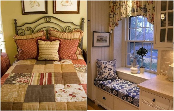 С чем у вас ассоциируется интерьер дачного домика? У нас – с деревенским стилем, для которого характерно наличие большого количества уютного текстиля. Включите фантазию, найдите в интернете вдохновляющие картинки и вперед творить! С текстилем переборщить достаточно сложно, но если вдруг вам покажется, что интерьер из уютного превратился в захламленный, просто уберите несколько подушек. Мягкую зону можно сделать на широком и укрепленном подоконнике. Все, что вам понадобится, – матрас, подходящий по размеру, плед и несколько декоративных подушек.