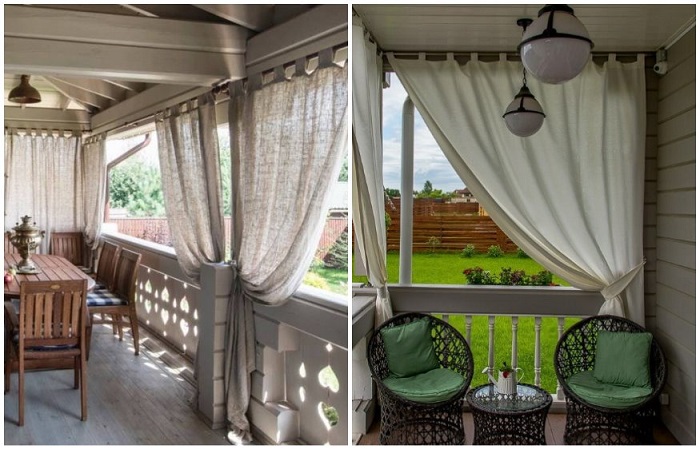 Мы уже говорили о текстиле в целом, но на занавесках хотелось бы остановиться более подробно. Они пригодятся в том случае, если ваша терраса или балкон попадают в поле зрения соседей, прохожих. Занавески не только смогут отгородить вас от ненужного внимания, обеспечить приватность, но также защитят от солнечных лучей в жаркий день, оградят от назойливых насекомых. И, конечно, не стоит забывать о том, что занавески – бонус к романтичной атмосфере, так как они дают возможность уединиться.