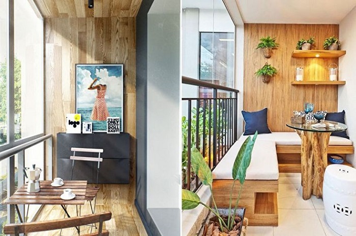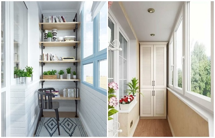 Здесь также все будет зависеть от размера балкона. Можно поставить закрытый встроенный шкаф с полками и ящиками для хранения пледов, подушек, посуды и пр. Если такая мебель смотрится чересчур громоздко и занимает все свободное пространство, то обратите внимание на открытые полки и стеллажи. Если вы планируете хранить небольшие вещи, то стоит подобрать разноцветные или прозрачные контейнеры: они прекрасно будут смотреться на полках, уберегут содержимое от пыли и грязи. Не хотите, чтобы ваши вещи были на виду? Скройте их за компактной раздвижной дверцей, красивой занавеской, подходящей под стилистику интерьера, или дверью-гармошкой. Еще одно практичное решение – настенные крючки и специальные конструкции для подвешивания. Но они пригодятся лишь в том случае, если вы планируете хранить на балконе крупногабаритные предметы: велосипед, санки и др.