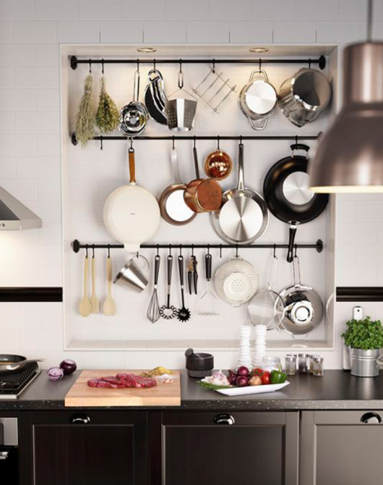 Поговорим еще немного о визуальном шуме: больше всего интерьер утяжеляют большое количество мелких предметов на виду. С этой точки зрения рейлинги являются самым страшным ночным кошмаром. Конечно, никто не спорит, что это очень удобное приспособление для рабочей зоны на кухне, так как оно позволяет компактно расположить различные кухонные принадлежности и девайсы. Однако рейлингов не должно быть слишком много, чтобы они не заняли почти весь фартук. Если же на них хранить абсолютно все, что есть на кухне, то интерьер будет захламленным и непрезентабельным. Совет: Проведите ревизию рабочей зоны и оставьте только те предметы, которыми пользуетесь ежедневно – именно они расположится на рейлинге. Все остальное сложите в контейнер и уберите в ящик. А еще лучше на этапе ремонта контролировать количество рейлингов – двух на фартук будет вполне достаточно.