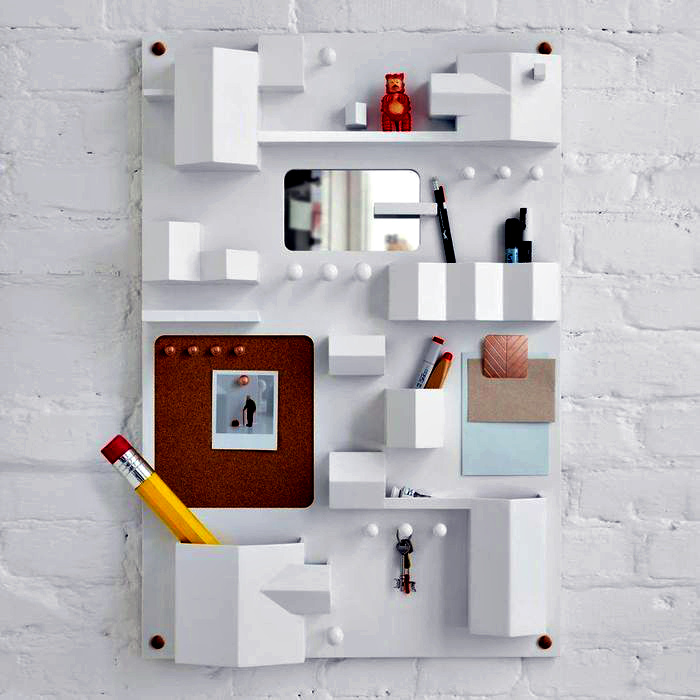 Настенный органайзер. | Фото: Pinterest. Доски-органайзеры - прекрасная альтернатива классическим полочкам. Настенные органайзеры имеют стильный вид, оборудованы несколькими типами полочек и крючков. Такой органайзер можно закрепить возле рабочего стола или в прихожей и хранить там всевозможные мелочи.