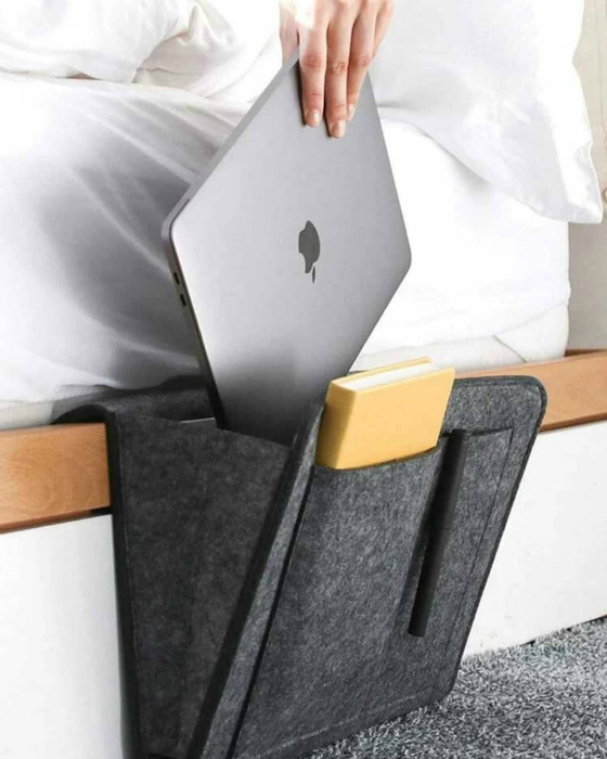 Карман для всякой всячины. | Фото: Imglade. Не огорчайтесь, если в вашей спальне не хватает места для прикроватной тумбочки, или у вас слишком много вещей. Решить проблему помогут специальные навесные карманы. Они крепятся к каркасу кровати и позволяют размещать внутри множество вещей: ноутбук, журналы, очки, лекарства и прочие мелочи.