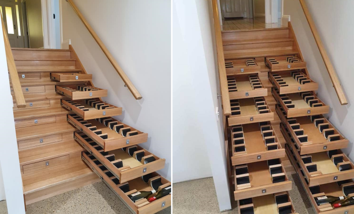 Довольно оригинальный способ хранения вина придумал австралийский строитель Мюррей Беррилл, который во время ремонта дома задумался, куда же можно надежно и не на виду пристроить 156 бутылок любимого напитка. Делать винный погреб – это очень много проблем и большие финансовые расходы, поэтому он решил сделать особенную лестницу. Под ее ступенями установил 12 выдвижных ящиков, в которых предусмотрены фиксаторы для бутылок. На создание самих ящиков мастер время не стал тратить, да и очень хлопотна сборка получилась бы, поэтому он купил в магазине уже готовые. А уже под их размер создавал конструкцию самой лестницы.