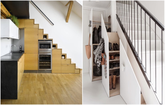 С боковой стороны лестничного марша можно спрятать все, вплоть до встроенной бытовой техники. | Фото: apartmenttherapy.com.