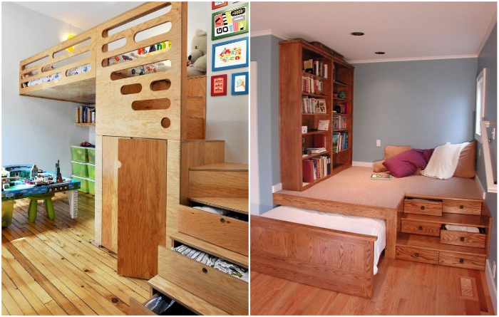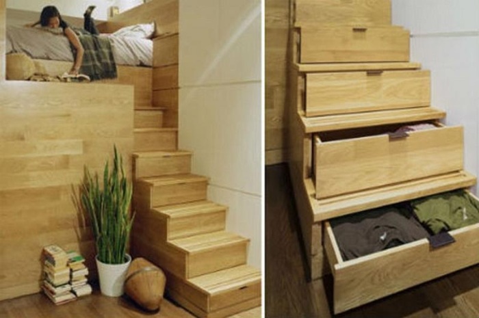 Лестницу, ведущую на кровать-чердак или подиум можно тоже сделать многофункциональной. | Фото: pinterest.ca/ radardetectors.ru.