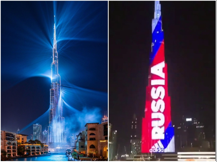 Зачастую Burj Khalifa окрашивают в цвета флагов различных стран или устраивают фантастическое лазерное шоу (Дубай). | Фото: nazarov-partners.com/ bugaga.ru.