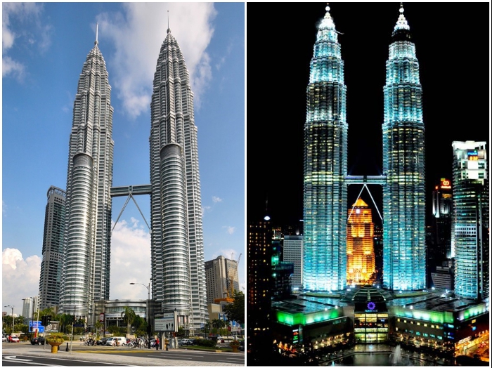 451,9-метровые Башни-близнецы Петронас (Petronas Twin Towers) признаны самым высоким сооружением в Малайзии и находятся на 16-м месте в общемировом рейтинге, но при этом являются самыми высокими башнями-близнецами в мире. Для малазийского народа комплекс Петронас стал своеобразным символом, объявившим миру о вступлении страны в мировую экономику. Это событие произошло в конце прошлого века и совпало со сдачей небоскреба в эксплуатацию (1998 г.). Поразительные формы, запечатленные в бетоне и металле, основаны на исламской геометрии, объединяют малайзийские традиции, идеалы и устремления в будущее. Особенно это заметно по одной из самых узнаваемых особенностей здания, по «небесному мосту», который соединяет две башни вместе.