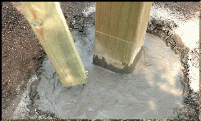 Чтобы столб стоял долго и крепко, его нужно засыпать не землей, а заливать бетоном. При этом важно также знать о том, что заливка должна выполнять немного выше уровня земли. Так, чтобы бетон выступал над ее уровнем хотя бы на 5-8 сантиметров. Это необходимо для того, чтобы вода не скапливалась у основания столба.