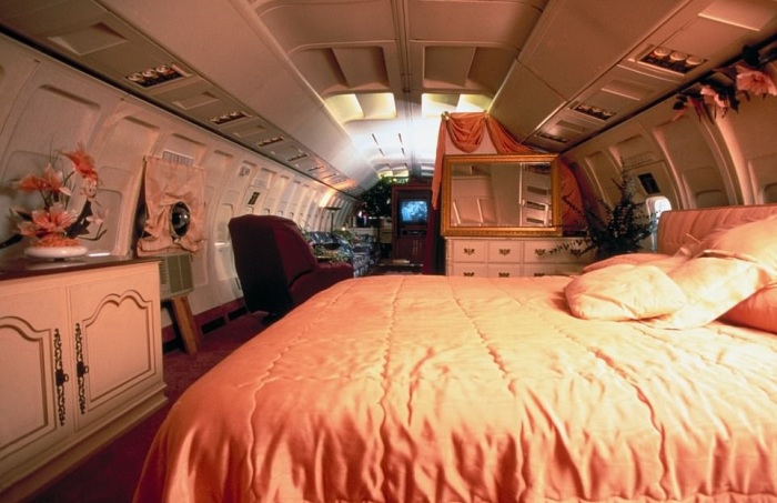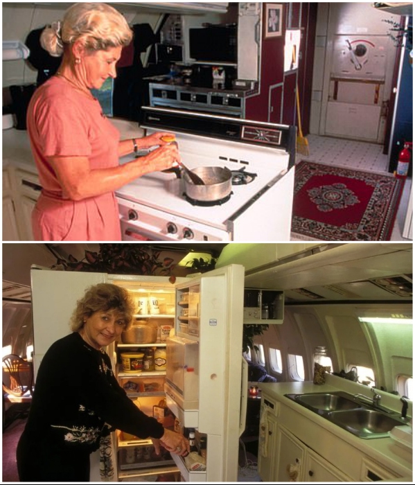 Убирать окна-иллюминаторы новая владелица не стала и теперь в ее резиденции целых 76 источников света в основной части авиалайнера, а еще есть огромные панорамные окна в кабине пилота. Из конструктивных элементов самолета остался один из санузлов, который продолжает выполнять функцию туалета. Также не изменились и верхние багажные отсеки, их очень удобно использовать в качестве встроенных систем хранения, ведь загромождать довольно ограниченное внутреннее пространство шкафами было не целесообразно.