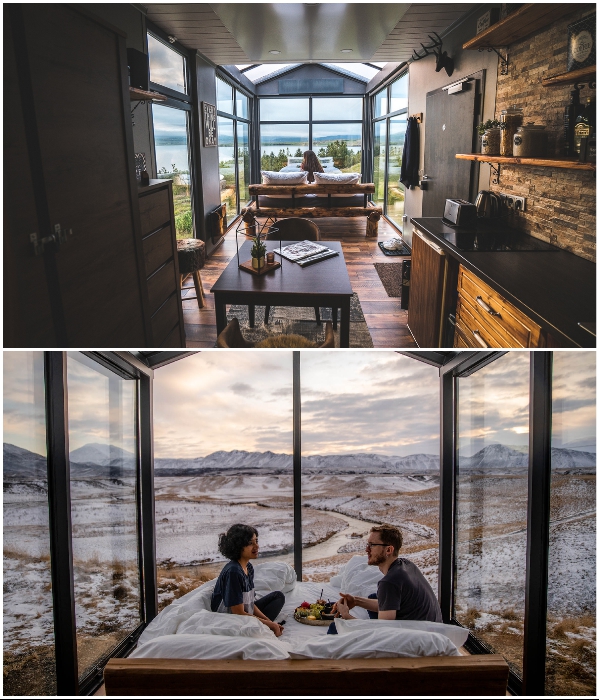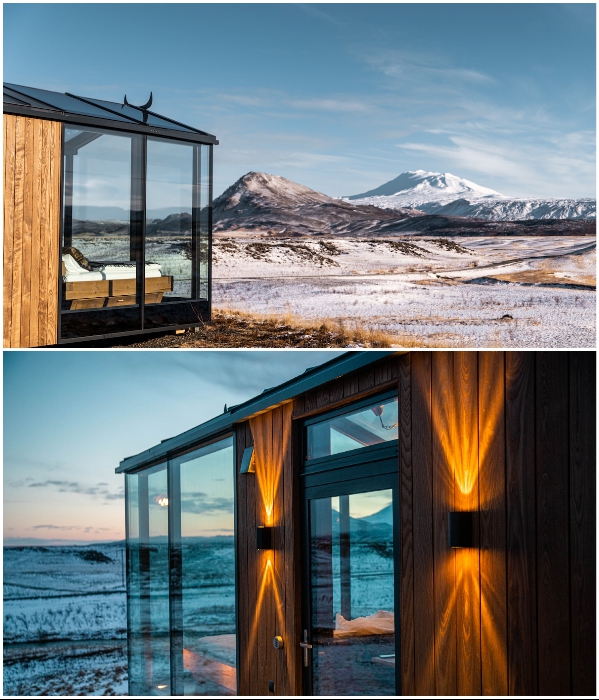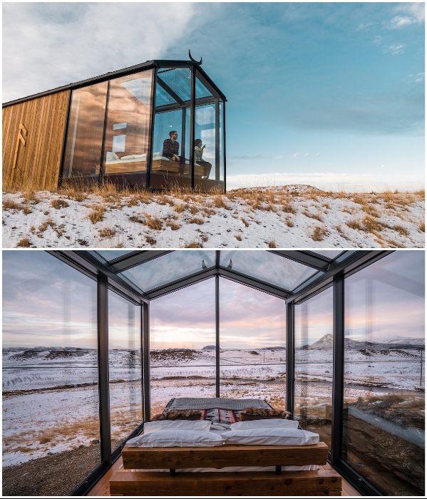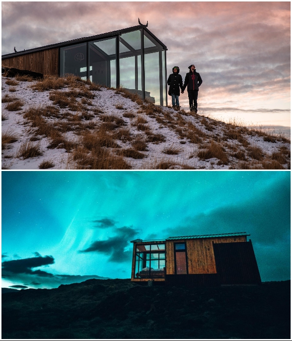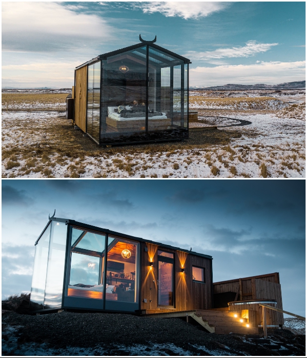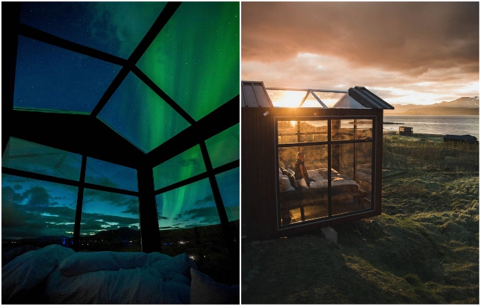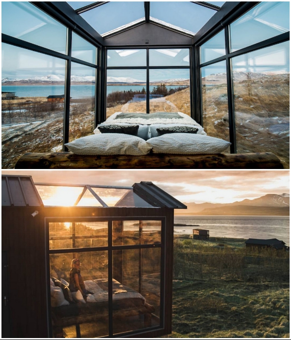 Стеклянный домик «Hlin» расположен на берегу фьорда Hval на западе Исландии. | Фото: panoramaglasslodge.com.