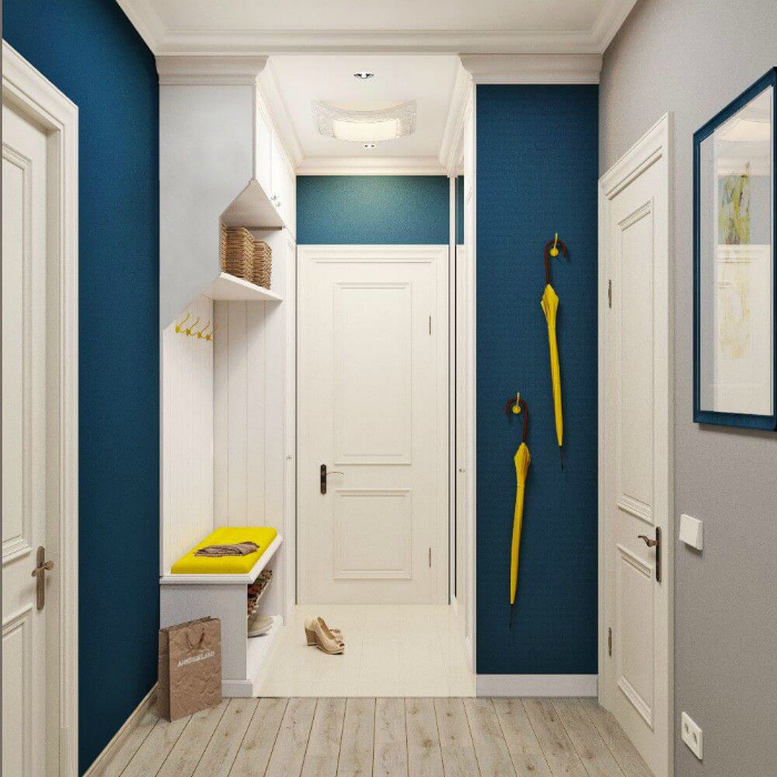 Контрастные сочетания в прихожей. | Фото: 5geo.ru. Контрастное сочетание насыщенного синего и белоснежного цвета помогло значительно изменить контуры небольшого помещения, а яркие желтые детали привнесли в интерьер сочность и красочность.