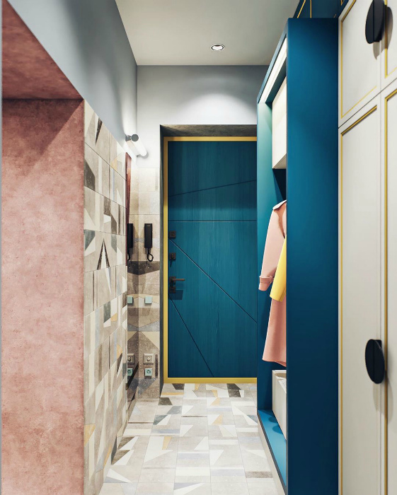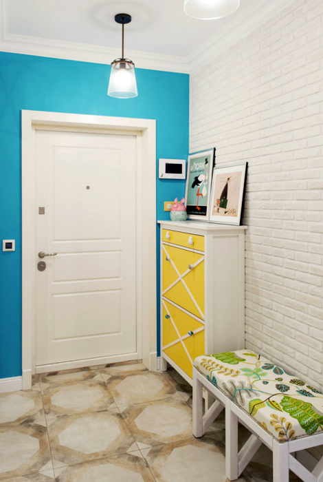 Прихожая в ярких цветах. | Фото: Terra Svet. По информации Novate.ru, яркие цвета отлично подходят для оформления небольших пространств. Главное, использовать не более трех оттенков и не переборщить. Примером умеренного использования цветовых акцентов является небольшая прихожая на фото, акцентными деталями которой стала голубая стена, комод с желтыми шкафчиками и диванчик с ненавязчивым принтом.