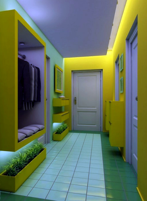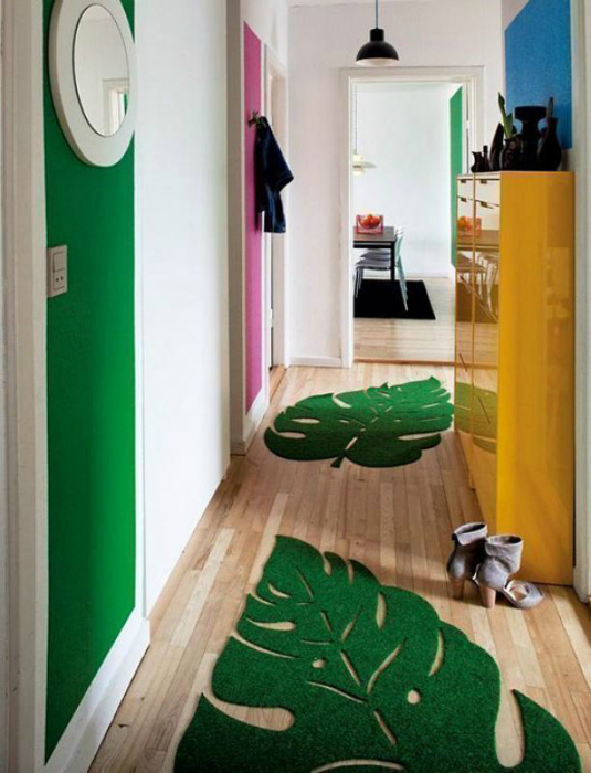 Зеленый цвет в интерьере. | Фото: Своими руками. А вот пример того, как с помощью одного оттенка легко освежить надоевший интерьер. Речь идет о насыщенном зеленом цвете. Несколько полосок на стенах и пара ковров в виде огромных листьев привнесут в прихожую яркость и нотки природной свежести.
