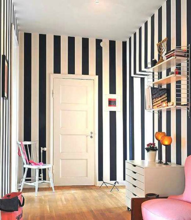 Полосатые обои в небольшой прихожей. | Фото: Яндекс. Принты в полоску способны творит чудеса, особенно когда речь идет о маленьких пространствах. Например, если нужно визуально увеличить площадь, выбирайте горизонтальные полоски. А если нужно приподнять потолки, отдайте предпочтение обоям с вертикальными полосками.