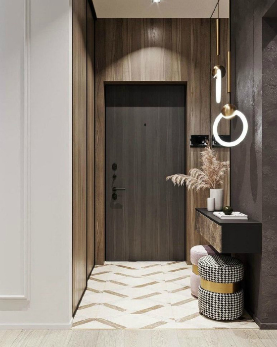 Стильные идеи дизайна маленькой прихожей. Мало кто из соотечественников может похвастаться внушительными размерами прихожей. Как правило, это небольшая проходная комнатка, в которой и развернуться-то сложно. Больше всех досталось владельцам «хрущевок». Казалось бы, как можно стильно оформить крошечное пространство? Не нужно отчаиваться, ведь современным дизайнерам есть что предложить. 1. Темное дерево Прихожая в цвете темного дерева. | Фото: Я Покупаю. Вообще-то, дизайнеры не очень любят темные фактуры и не рекомендуют их использовать в маленьких помещениях. Собственно, основная ошибка людей, предпочитающих темные фактуры - недостаток света. Из-за этого небольшие пространства становятся похожими на баню, пещеру или коробку. Чтобы такой неприятности не произошло, сочетайте темные стены со светлым полом и потолком. Также не забудьте про несколько источников теплого света, расположенных на разных уровнях. 2. Яркая геометрия Яркие акценты и геометрические принты. | Фото: Imgund. Отменное сочетание мозаики с геометрическим принтом и ярко-синих плоскостей. Чтобы грамотно расставлять акценты, нужно выбрать несколько самых крупных и броских вещей и выкрасить их в выбранный оттенок. 3. Фактурная стена Фактурная стена из дерева. | Фото: Я Покупаю. Всем любителям минимализма и лаконичного дизайна придется по вкусу сочетание белых стен с фактурными деревянными панелями. В качестве дополнительных деталей дизайнер выбрал узкое зеркало, навесную тумбу и уютный пуфик. 4. Элегантность Элегантное сочетание фактур. | Фото: Salon.ru. Ни для кого не секрет, чтобы добавить помещению объема и пространства, нужно использовать светлые оттенки. А для того, чтобы пространство не выглядело скучно, добавьте разнообразных фактур: замшевый диванчик, фурнитуру, стилизованную под медь, шкафчик из имитации натурального камня и глянцевые рамки. Все это добавит интерьеру лоска и элегантности. 5. Уникальная мебель Минималистичная прихожая с необычной мебелью.| Фото: The Village. Если вам достался узкий длинный коридор, не занимайте всю его площадь длинным шкафом-купе, лучше разделите коридор на несколько зон. Одной из зон может стать крупная система хранения с нишей, украшенная большой панелью, стилизованной под дерево, и подсветкой. Также в прихожей есть большое зеркало, маленькая полочка и узкий платяной шкаф. 6. Заметные детали Прихожая с оригинальными деталями. | Фото: Яндекс. Если простая светлая отделка выглядит слишком скучно, сделайте акцент на необычных и функциональных деталях. Такими могут стать система открытых деревянных ящиков, оригинальные крючки для одежды, деревянная панель с большим зеркалом и мозаичный пол с ненавязчивым геометрическим принтом. 7. Природные материалы Прихожая с эффектным природным акцентом. | Фото: www.pinterest.ru. Невероятно, как фактурные деревянные панели могут преобразить заурядный интерьер небольшой прихожей. Сочетание светлых стен с броскими природными акцентами помогают приподнять потолок и добавить помещению объема. 8. Драгоценный изумруд Прихожая в благородном зеленом оттенке. | Фото: Pinterest. Несмотря на то, что дизайнеры рекомендуют с осторожностью использовать темные оттенки, именно с их помощью можно создать глубокий, сложный интерьер. Примером грамотного использования цвета можно назвать эту небольшую прихожую в сложном изум
