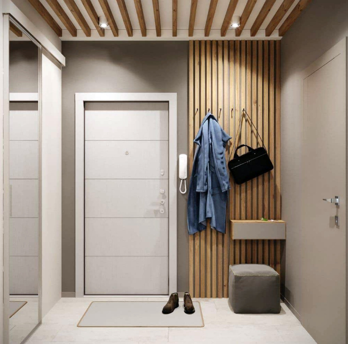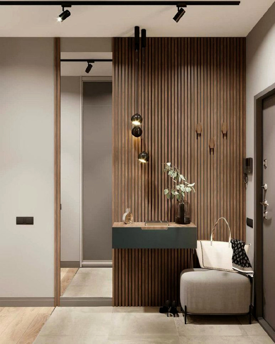 Прихожая с эффектным природным акцентом. | Фото: www.pinterest.ru. Невероятно, как фактурные деревянные панели могут преобразить заурядный интерьер небольшой прихожей. Сочетание светлых стен с броскими природными акцентами помогают приподнять потолок и добавить помещению объема.