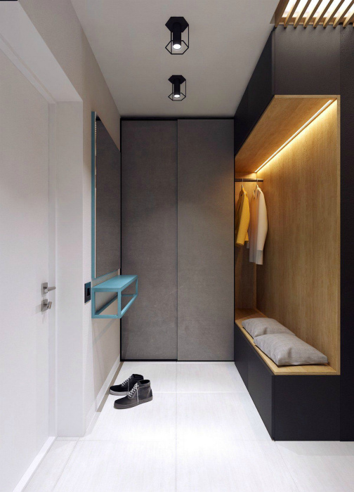 Минималистичная прихожая с необычной мебелью.| Фото: The Village. Если вам достался узкий длинный коридор, не занимайте всю его площадь длинным шкафом-купе, лучше разделите коридор на несколько зон. Одной из зон может стать крупная система хранения с нишей, украшенная большой панелью, стилизованной под дерево, и подсветкой. Также в прихожей есть большое зеркало, маленькая полочка и узкий платяной шкаф.