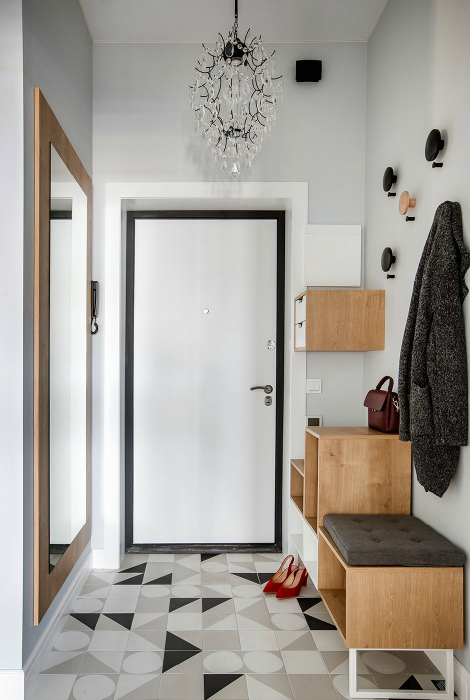 Прихожая с оригинальными деталями. | Фото: Яндекс. Если простая светлая отделка выглядит слишком скучно, сделайте акцент на необычных и функциональных деталях. Такими могут стать система открытых деревянных ящиков, оригинальные крючки для одежды, деревянная панель с большим зеркалом и мозаичный пол с ненавязчивым геометрическим принтом.
