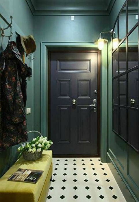 Прихожая в благородном зеленом оттенке. | Фото: Pinterest. Несмотря на то, что дизайнеры рекомендуют с осторожностью использовать темные оттенки, именно с их помощью можно создать глубокий, сложный интерьер. Примером грамотного использования цвета можно назвать эту небольшую прихожую в сложном изумрудном оттенке, с контрастным белым полом и мягким пуфиком салатного оттенка.