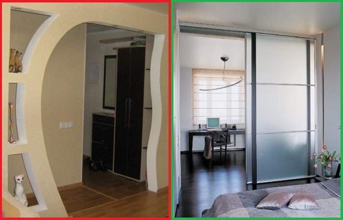 Говоря об устаревших трендах, нельзя не вспомнить о художественных арках, часто присутствующих в узких коридорах, фигурных фальшстенках и нишах, изготовленных из гипсокартона. Главной причиной, по которой эти интерьерные приемы сошли с пьедестала, стало отсутствие функциональности. Кроме того, они занимают слишком много места, а для малогабаритных квартир это неприемлемо. Сейчас дизайнеры предпочитают избегать дверей, как таковых и оставлять квадратную форму проемов. Для зонирования активно используются «ажурные конструкции», среди которых вертикальные деревянные балки, стеклянные перегородки, тонкие металлические панели, выполненные с помощью художественной резки, и пр.