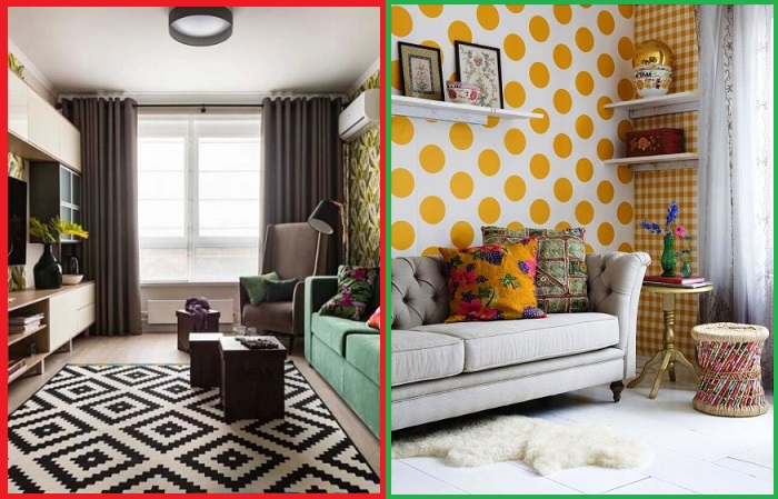 Например, можно оформить акцентную стену – она создаст контраст со светлым полом или ковром с геометрическим принтом, которые зрительно увеличивает пространство. А вот если покрасить все стены в белый или бежевым, то интерьер станет бледным и абсолютно невыразительным.