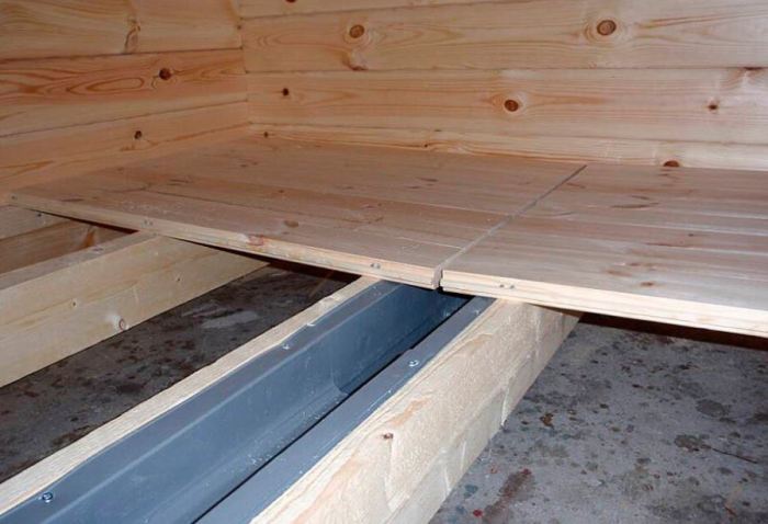 Как только вопрос вентиляции будет решен, останется преодолеть еще одну важную проблему – удаление воды с пола. Для этого необходимо правильным образом сделать банный пол. В нем должны быть специальные прорехи или даже прорези для того, чтобы вода уходила в подпольное пространство. Это защитить дерево от гниения, а саму баню от холодно сквозняка. Лучшим решением станет создание одного или нескольких отверстий с находящимися под ними бетонными чашами для сбора и отведения воды прочь из-под пола.