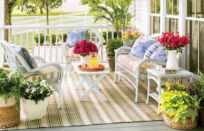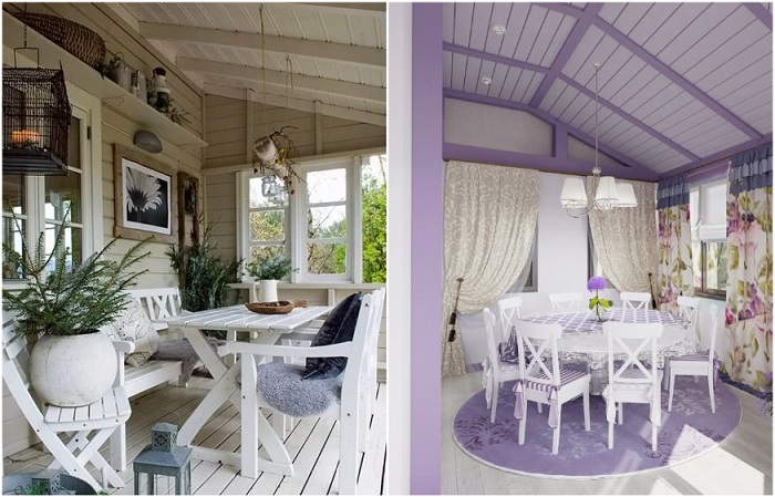 Что касается мебели, то это могут быть либо деревянные варианты, либо кованые. В центре веранды хорошо будут смотреться два кованых стула и столик белоснежного цвета. А если есть возможность, можно купить диванный пуфик или кресло. Однако не забывайте, что если выбор пал на мягкую мебель, то у нее должны быть деревянные ножки и льняная обивка. В результате получится очень светлая, нежная, романтичная веранда с интересным декором и натуральными материалами, которая придется по душе всем друзьям и членам семьи.