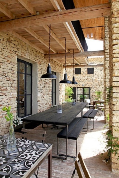 Если в провансе главным материалом является дерево, то в лофте – железо. Оно не обязательно должно блестеть, как новое, подойдут и потертые экземпляры, будто испачканные машинным маслом. Еще один важный атрибут стиля – потертая кожа коричневого цвета. Иногда используется бетон и дерево. Выбирая мебель для веранды, следует помнить, что она должна быть стильной и в небольшом количестве. Отдайте предпочтение деревянному столу на железных массивных ножках и грубым стульям. Вместо них можно поставить диван, сделанный своими руками. Для этого сварите между собой тонкие пруты, которые станут каркасом, и положите сверху несколько больших подушек из плотной ткани.