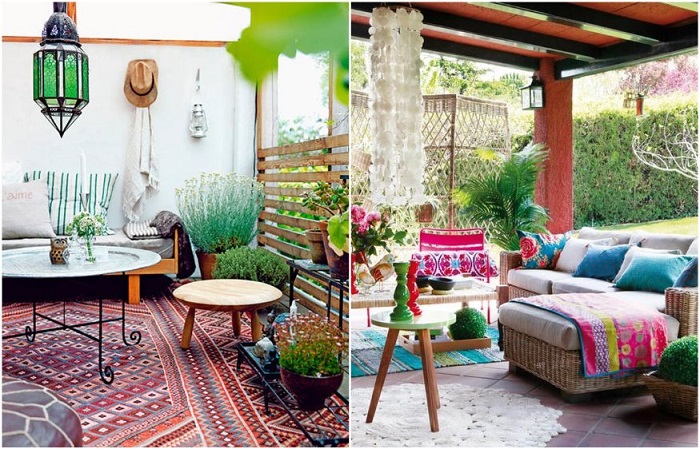 Если вам близки по духу пестрые принты и старинные вещи из разных стран, значит бохо-шик – это то, что вам нужно. Он представляет собой сплетение элементов разных стилей, начиная с гранжа, фолка, и заканчивая винтажным. Такая веранда может стать собранием ваших впечатлений от поездок и путешествий, а в центре будут привезенные из-за границы сувениры. Это могут быть восточные ковры, вазы в индийском стиле, азиатские деревянные полочки и так далее. Для бохо-шик характерны яркие цвета (красный, оранжевый, желтый, зеленый), самобытный рукотворный декор, обилие мебели и аксессуаров, порядок, который граничит с беспорядком, использование натуральных материалов. Веранду украсят полы, столики, табуреты из дерева. Стены также можно частично облицевать досками. Что касается декора, то идеальным вариантом станут изделия из ротанга, соломы, джута. Также можно использовать гламурные детали: бисер, перья, кружево, мех.