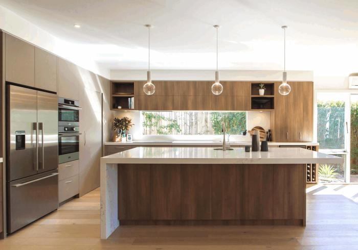 Современный стиль обычно подразумевает лаконичные фасады, но яркие формы. Например, глянцевый кухонный гарнитур, где часть шкафчиков интересного акцентного оттенка или яркий кухонный фартук. Такая кухня обычно смотрится предельно современно, а по стоимости ремонт стоит даже меньше, чем эталонный скандинавский. В современном стиле часто можно встретить встроенную бытовую технику, и речь идет не только о духовом шкафе с плитой. Например, вы найдете здесь незаметный за однотонным фасадом холодильник, интегрированную кофе-машину, невидимую посудомоечную машину или даже дополнительные гаджеты: фритюрницу, гриль тепан-яки, wok-панель и т.п.